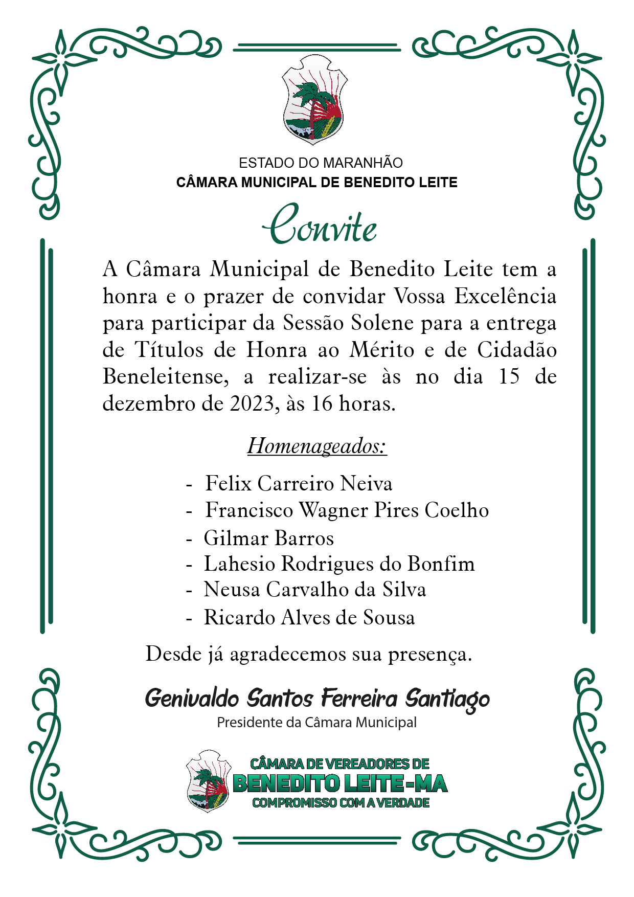 convite sessão solene do dia 15 de dezembro de 2023